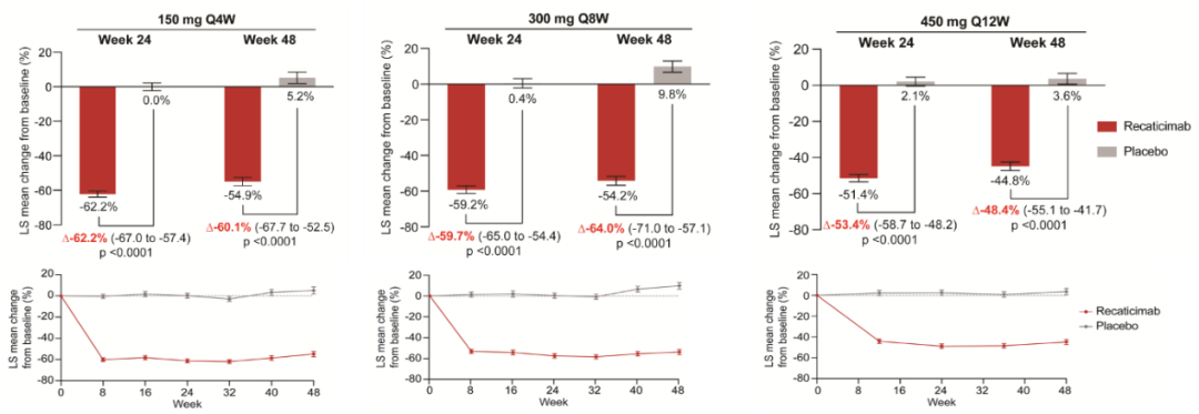 主要终点:与安慰剂相比,瑞卡西单抗150 mg Q4W治疗24周后LDL-C相对于基线降低62.2%(95%CI: -67.0, -57.4);300 mg Q8W治疗24周后LDL-C相对于基线降低59.7%(95%CI: -65.0, -54.4);450 mg Q12W治疗24周后LDL-C相对于基线降低53.4%(95%CI: -58.7, -48.2)(各组P<0.0001 vs. 安慰剂)。